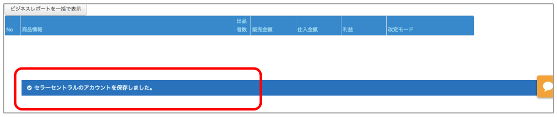 「セラーセントラルのアカウントを保存しました。」の表示が出たら設定完了です。